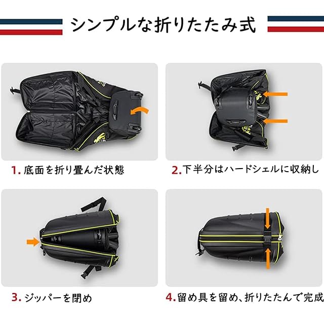 【折り畳み方式】まず底面を折りたたんでハードシェルに上向きに収納し、ファスナーをしっかり閉めて留め具を留めれば折りたたみ完了です。