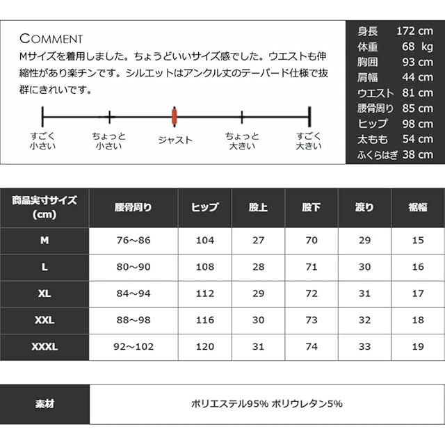 【Mサイズ】腰骨周り76~86cm・ヒップ104cm・股上27cm・股下70cm・渡り幅29cm・裾幅15cm【Lサイズ】腰骨周り80~90cm・ヒップ108cm・股上28cm・股下71cm・渡り幅30cm・裾幅16cm【XLサイズ】腰骨周り84~94cm・ヒップ112cm・股上29cm・股下72cm・渡り幅31cm・裾幅17cm【XXLサイズ】腰骨周り88~98cm・ヒップ116cm・股上30cm・股下73cm・渡り幅32cm・裾幅18cm【XXXLサイズ】腰骨周り92~102cm・ヒップ120cm・股上31cm・股下74cm・渡り幅33cm・裾幅19cm