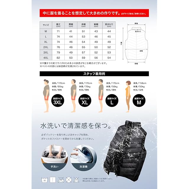 ✅【豊富なサイズ展開】M、L、XL、2XL、3XL、4XL。豊富なサイズ展開で男女兼用でお使いいただけます。画像のサイズ表をご参考のうえ、ご注文お願いいたします。【パッケージ内容】ヒートベスト・取扱説明書(書付き) 【洗濯可能】ヒーター付きベストは洗濯可能です。※必ずモバイルバッテリーを取り外して、USBキャップを閉めてから洗濯してください。