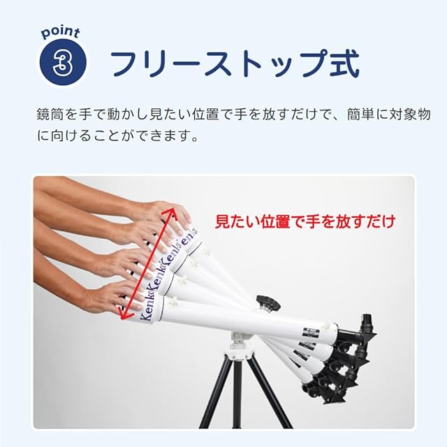 ・フリーストップ式<br> 鏡筒を水平・垂直方向に手で動かし見たい位置で手を放せば止まってくれるので、簡単に対象物に向けることができます。
