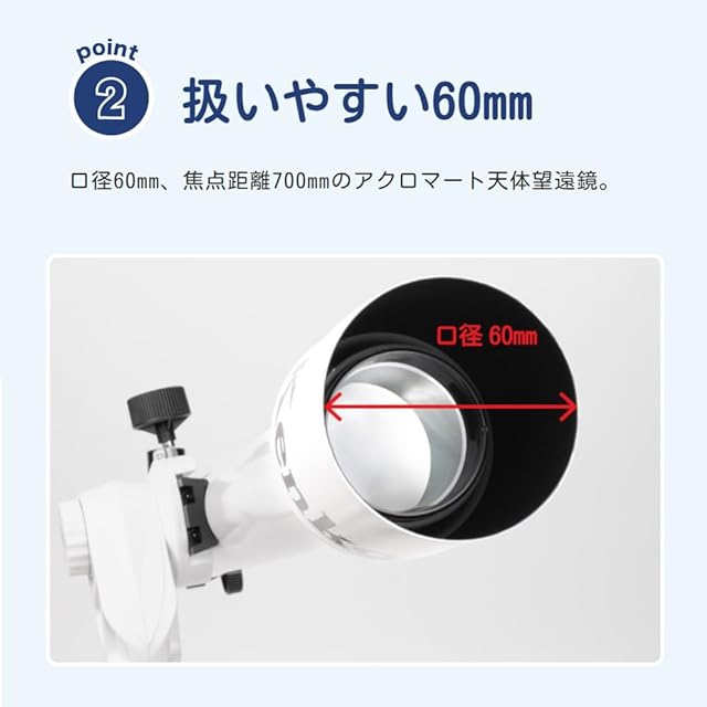 ・扱いやすい60mm<br> 口径60mm、焦点距離700mmのアクロマート天体望遠鏡。透過率の高いマルチコート採用。