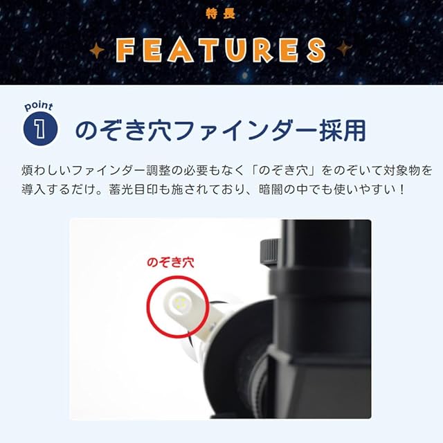・のぞき穴ファインダー採用<br> 煩わしいファインダー調整の必要もなく「のぞき穴」をのぞいて対象物を導入するだけ。短めの焦点距離と相まって対象物を導入しやすい仕様となっています。のぞき穴には、導入しやすいように蓄光目印が施されており暗闇の中でも使いやすい仕様になっています。