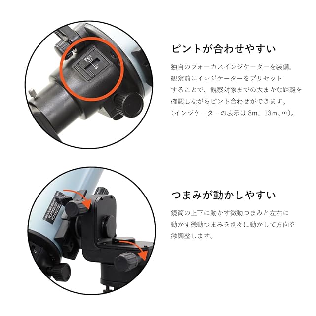 天体望遠鏡を使い慣れていない方でもピントが合わせやすい、独自のフォーカスインジケーターを装備。観察前にインジケーターをプリセットすることで、観察対象までの大まかな距離を確認しながらピント合わせができます(インジケーターの表示は8m、13m、∞)。