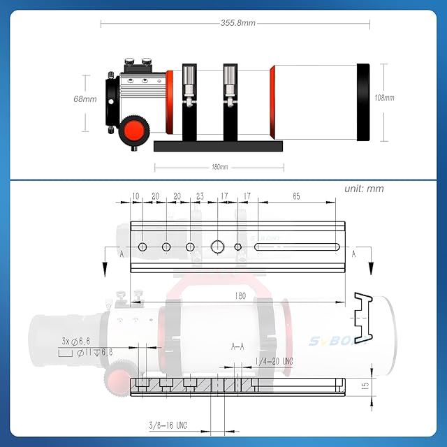 フォーカシングシートはマグネシウム合金素材で、同仕様のアルミニウム合金素材に比べて20%以上軽量化が可能です。負荷を軽減し、持ち運びに便利です。180mmダブテールプレートを付属します。中空のデザイン、操作が簡単、設定が簡単、アクセサリの選択がより多様になり、望遠鏡がより安定します。