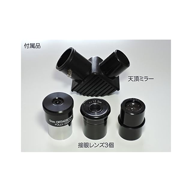 天体望遠鏡本体、架台・三脚、接眼レンズ、天頂ミラーのセット。