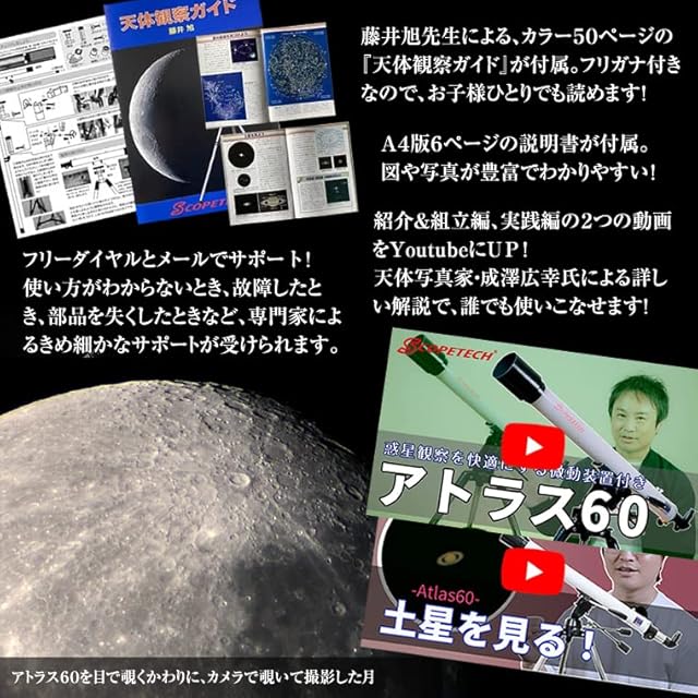 スコープテック 天体望遠鏡セット アトラス60 日本の工場が本気で作った初心者用望遠鏡 子供 キャンプ クレーター 土星の環が見える 木星の縞が見える 金星 月 天体観測(10歳~大人)