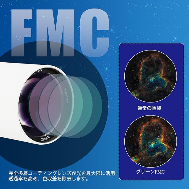 F/6.5短焦比:f/6.5の短焦点比により、より広い視野が得られます。より多くの光を集めることができるため、画像が明るくなり、観察対象がより鮮明で観察しやすくなります。広角の天体写真撮影に非常に便利です。