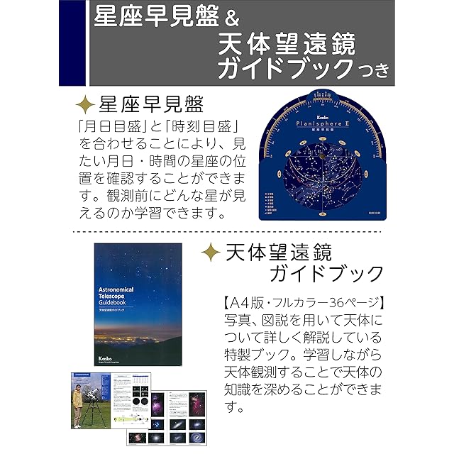 【天体への知識を深めながら観測を楽しもう!】望遠鏡に必要な付属品のほか、より知識が深まる天体ガイドブックや星座早見盤が付属。お子さまの学習にもぴったり。