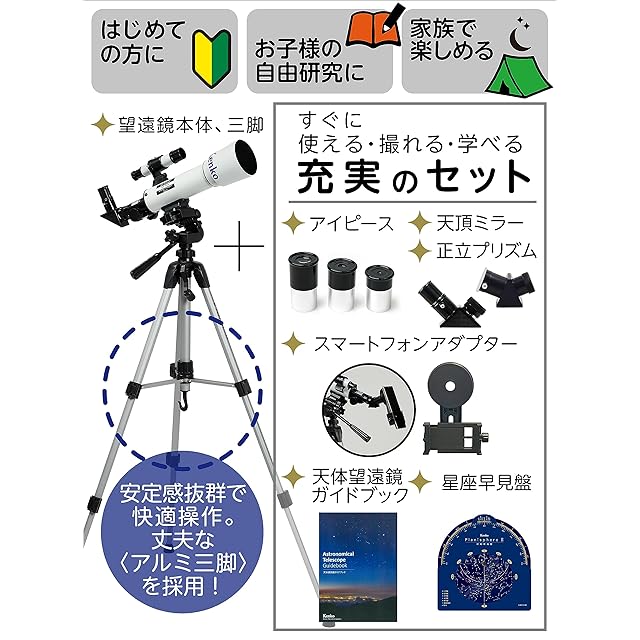 付属品: アルミ三脚、アイピースx3(4mm / 12.5mm / 20mm)、5x24ファインダー、天体観測用天頂ミラー、地上観察用正立プリズム、スマートフォンアダプター、天体ガイドブック、取扱説明書、星座早見盤
