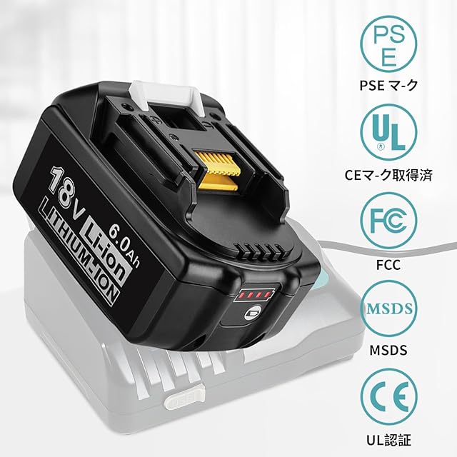 商品名:マキタ18Vバッテリー互換BL1860B対応マキタバッテリー 6.0Ah BL1830 BL1840 BL1850 BL1860 BL1830b BL1840b BL1850b リチウムイオン 電池 LED残量表示付き 電動工具用 マキタ互換 PSE認証済 4個セット 2億円の製造物責任険付