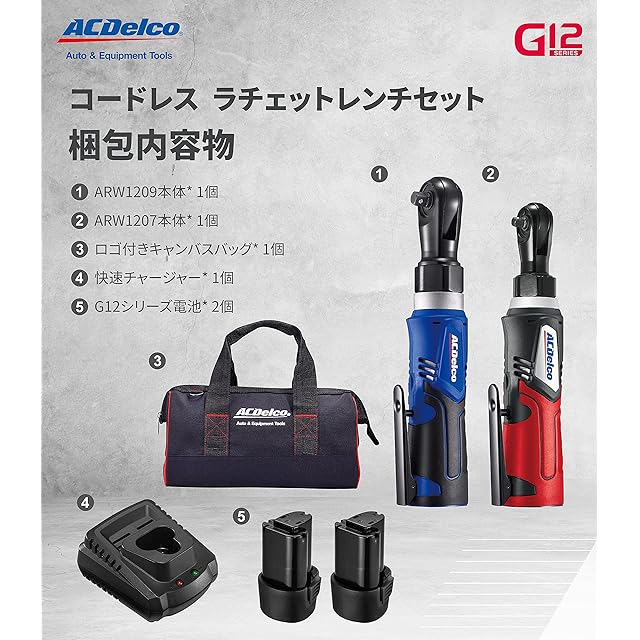 商品名:ACDelco G12 10.8V 充電式 ラチェットレンチ ツールセット 1/4”(6.35mm) & 3/8” (9.53mm) リチウム電池2個 (日本語取扱説明書.キャンバスバッグ付)ARW1209-K92