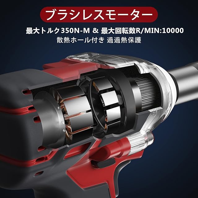 【純銅ブラシレスモーター】:電動インパクトレンチ ブラシレスモーター搭載で高効率を実現したインパクトスパナ。最大トルクは350Nmで、過電流保護、過電圧保護、過熱保護、充放電保護など安全性・耐久性にも配慮しています。車の修理、タイヤ交換、ホームメンテナンス、ナットの締め付けやボルトの緩めなどに最適です。