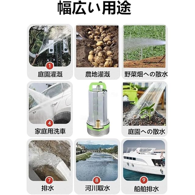 様々なシーンに対応、優れた携帯性:高い汎用性と携帯性が魅力です。家庭用給水:庭の花や車への給水、水回り、シンクのバケツやタンクからの給水など。ガーデン&ガーデニング:小川、井戸、雨水タンクなどから家庭菜園や庭園へ水を散水します。排水サポート:低い位置の漏水除去、小さなプールや池の排水、軽度の水浸しの除去に。