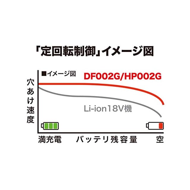 ミドルクラス最速穴あけ(国内/2020年11月当社調べ)。高速回転2,200min-1+定回転制御で高効率。石工穴あけスピード約35%アップ※(マキタ18V機比)。※超硬ドリルφ8mm、レンガ穴あけ深さ30mm時※写真は石工穴あけφ13mm