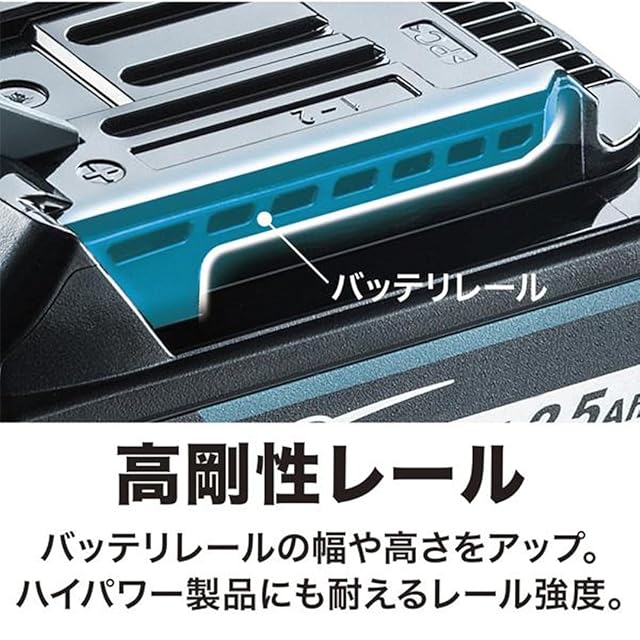 マキタ純正品(箱入)<br>●最適給電+最適充電の次世代バッテリ●パワーを最大限に引出し高負荷時の作業時間アップ(高負荷時の連続作業時間最大約2.2倍)●パワーアップとバッテリ長寿命化を両立(連続した高負荷作業時においても長寿命を実現、バッテリ寿命約50%アップ)●最適給電システム/工具とバッテリと充電器の間で最適化デジタル通信これによりバッテリの状態に応じて工具とバッテリ間の給電制御を最適化しバッテリ負荷を最小化●専用設計ならではのIP56高耐久仕様/端子短絡防止構造/防水3層構造/高剛性レール/衝撃吸収構造(耐衝撃性40%アップ)
