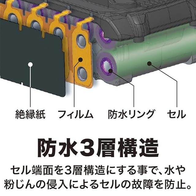 『IP56』にも対応※した防じん・防水性能(※:バッテリ単体での保護等級です。工具本体にバッテリを装着した場合は、本体側の等級に準じます。粉じんや水によって故障しないことをするものではありません。)