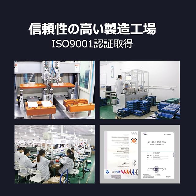【高品質と認証】高品質なリチウムイオン電池セルを採用。PSE(日本適合性マーク)、CE、RoHSなどの規格認証を取得しており、信頼性と耐久性に加え、環境基準にも適合しています。