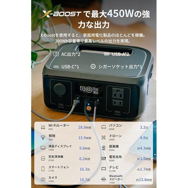 【稼働時間大幅延長ぽーたぶる電源】RIVER 3ぽーたぶる電源は先進の窒化ガリウム(GaN)を活用し、小型電化製品(100W未満)の稼働時間を大幅に延長(従来品比)。家庭内の停電対策向上に、長時間アウトドア活動に、最適です。