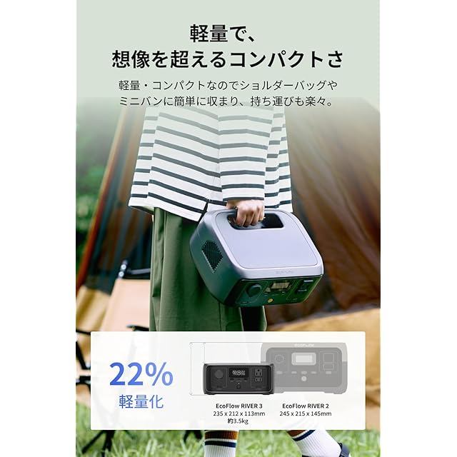 【超小型ポータブル電源】RIVER 3小型ポータブル電源は先進の窒化ガリウム(GaN)を活用し、高エネルギー効率&低エネルギー損失を実現します。軽量・コンパクト設計のためショルダーバッグやミニバンに簡単に収納、持ち運び容易です。