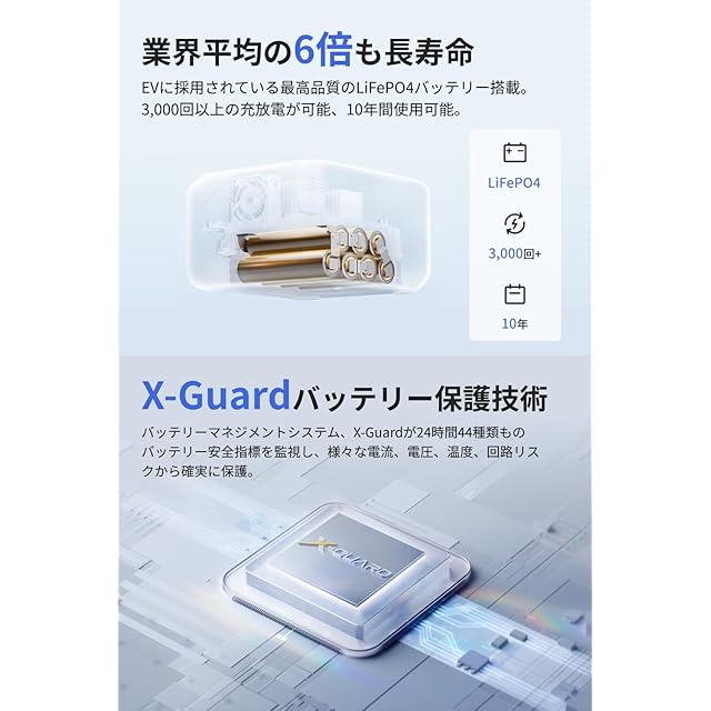 【長寿命バッテリー&X-Guardリン酸鉄ポータブル電源】RIVER 3リン酸鉄ポータブル電源シリーズのバッテリーは、3,000サイクル後(10年間使用に相当)でも放電容量80%を実現。バッテリー管理システムX-Guardは24時間44種類ものバッテリー安全指標を監視し、多様なリスクから保護します。
