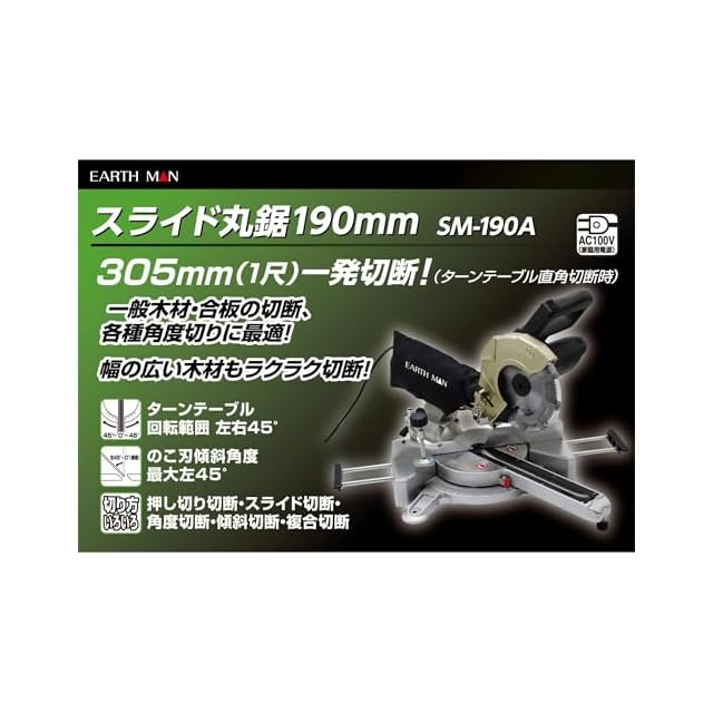 高儀(Takagi) EARTH MAN スライド丸鋸 190mm SM-190A 最大切断幅305mm のこ刃傾斜角度左45度まで 卓上丸ノコ AC100V コード式 たかぎ TAKAGI