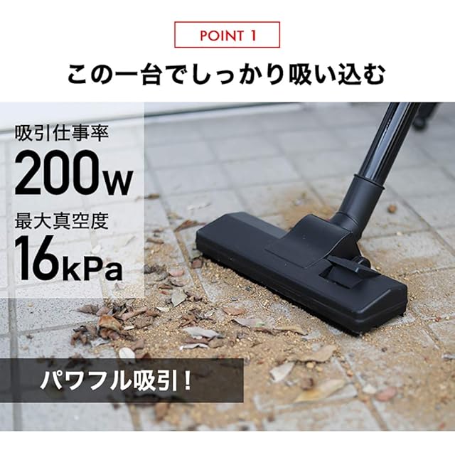 吸引仕事率:200W モーター:ブラシレスモーター 最大真空度:(Low:9kPa High:16kPa) 最大風量:1.1㎥/min タンク容量:20L 集じん容量:12L 吸水容量:12.5L スイッチ:LOW/OFF/HIGH