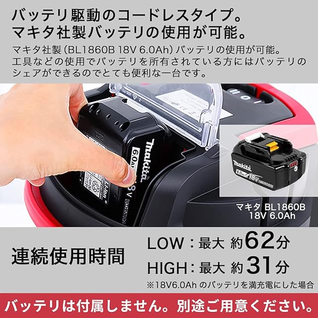 IEC 規格:IPX4(防水性能) 連続使用時間※1:Low:最大約62 分、High:最大約31 分(18V6.0Ah のバッテリを満充電にした場合) ※1.ホースの接続なし、フィルタ装着なしの無負荷状態でのおおよその時間です。バッテリの新旧、状態によっても変わります。