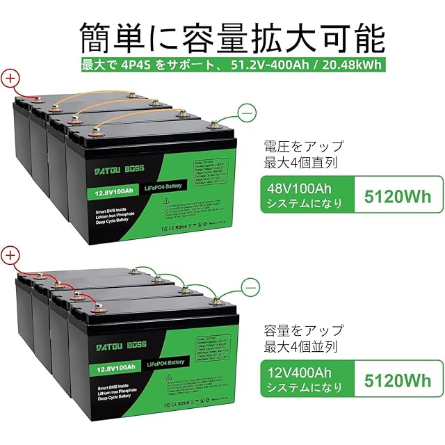【高い容量拡張性】DATOUBOSS リン酸鉄リチウムイオンバッテリーは、容量の拡張が可能です。複数のバッテリーを直列または並列接続することで、必要な容量や電圧を簡単に調整できます。これにより、さまざまな用途に柔軟に対応することができます。