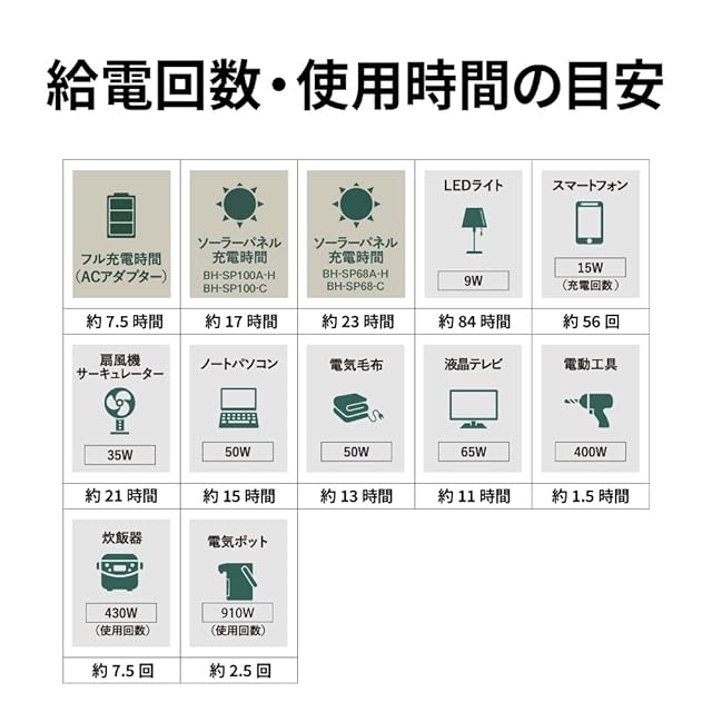 AC出力:100V/10A/60Hz 1,000W (瞬間最大2,000W) USB出力:最大66W DC出力:最大120W(DC12V/10A シガーソケット)