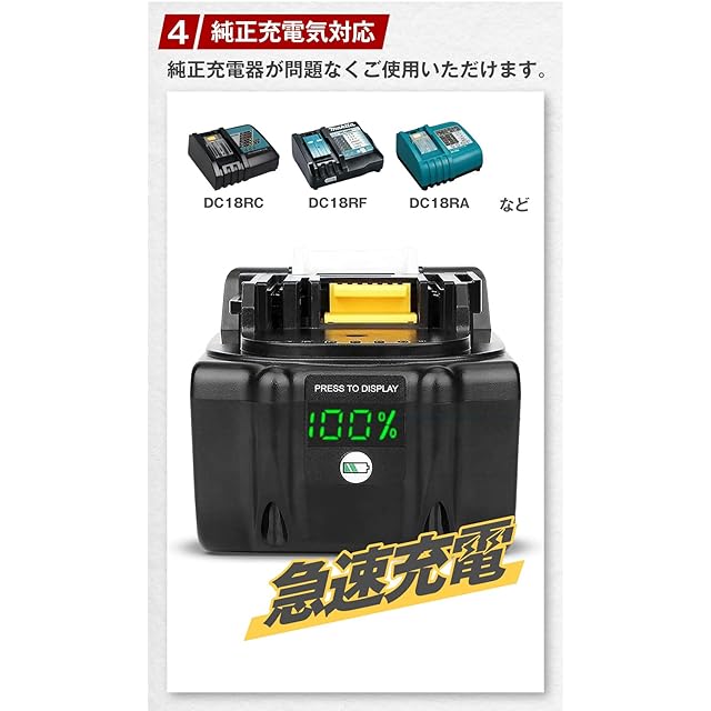 【商品説明】日本の会社が安全性や品質にこだわって企画し、正規のPSEの届け出を自社で行い、ISO9001認証の信頼できる中国工場にて生産しているMAKITA 互換バッテリーです。マキタ純正の電動工具はもちろん、草刈機、掃除機、集塵機、ブロアー、空気入れなど18Vの機種には全て対応しており、問題なくご使用いただけます。DC18RC、DC18RF、DC18RAなどの純正バッテリー充電器での充電も可能です。