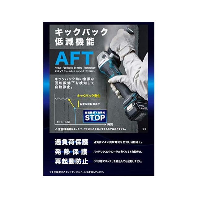 AFTでキックバック時の急激な回転数低下を検知して自動停止。キックバック低減機能付