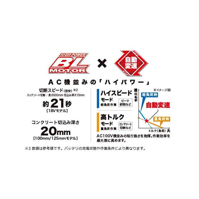AC機を超える切断能力。(マキタ100mmAC機比)。切断スピード約40%アップ(マキタ100mmAC機比)。最適給電システム+大型コントローラで重負荷連続作業量約2倍(マキタ18V機比)