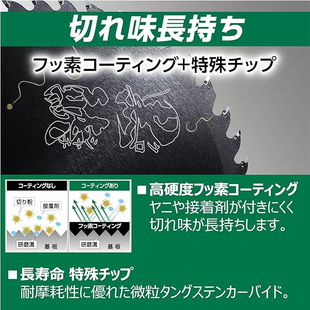 フッ素コーディングと特殊チップで長持ち。当社従来製品 スーパーチップソー(60P)と比較し推定寿命は2.3倍! ※数値は参考値です。材料や条件により異なります。