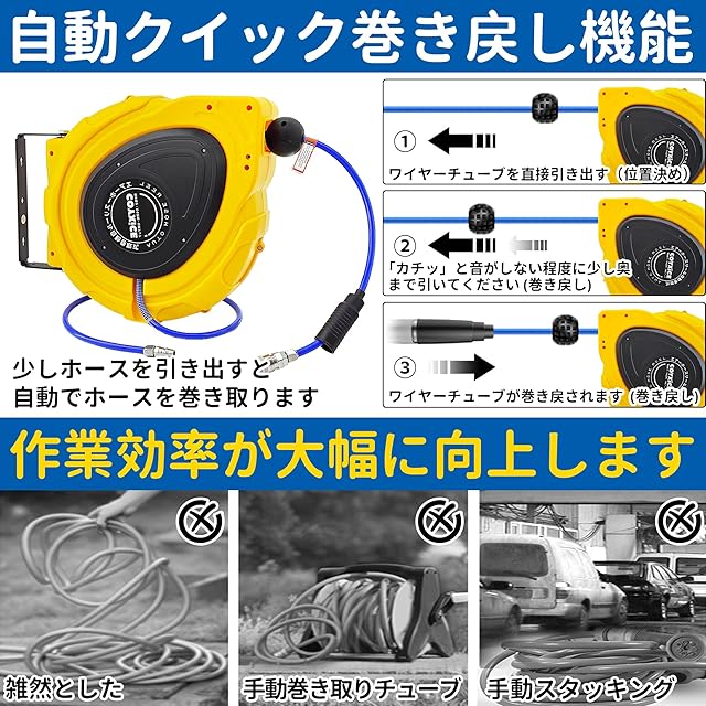【簡単で効率的】エアホースの最大長さは20mで、自由に引き出すことができます。早く巻き取っても絡まないもつれ防止機能付き。お好みの長さに調整でき、使用後、再びホースを軽く引くと、スプリングの働きで自動的にホースが巻き取られるので、後片付けが簡単で、整然とした作業環境を保つことができます。