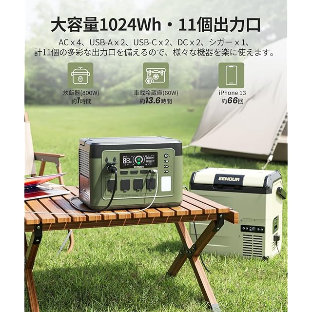 EENOUR ポータブル電源 P1000PLUS 大容量 1024Wh/320000mAh 43分満充電 APP対応 AC充電ワット数調整可 高出力 定格1800W(瞬間最大3600W) AC/DC/USB出力 PD100W LEDライト付 UPS機能 リン酸鉄リチウム電池 PSE認証済 純正弦波 50Hz/60Hz MPPT制御 防災グッズ 車中泊 キャンプ用