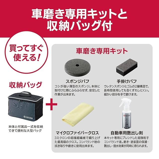 商品名:京セラ(Kyocera) 旧リョービ プロ用 ポリッシャー APED130KT 637051A ブラック 【車の水垢取りや艶出しが素早く簡単にできる】 車磨き専用キット 収納バッグ ダブルアクション機構搭載 繊細な作業や最終仕上げに最適 電源コード5m