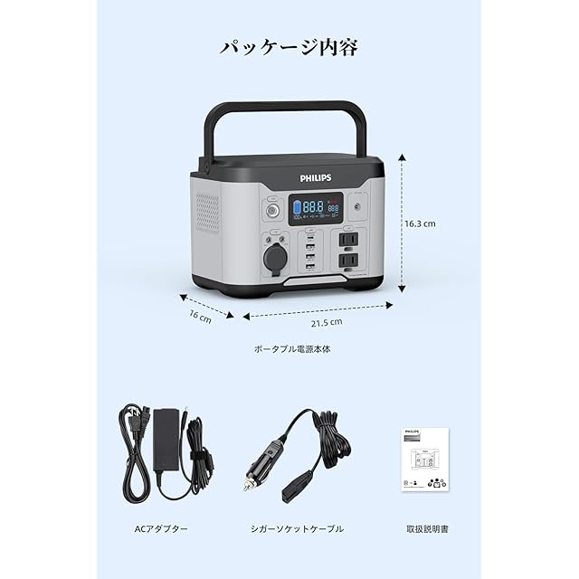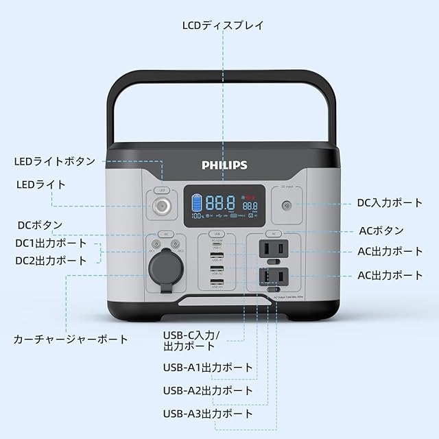 商品名:Philips 300W/296Wh(14. 8V換算) ポータブル電源 大容量 ポータブルバッテリー バックアップ電源 9台同時充電 パススルー機能 純正弦波 AC(瞬間600W)/DC/PD 60W USB-C/シガーソケット出力 5つ充電方法 ledライト付 非常用電源 ソーラー充電 PSE認証済 DLP8091C