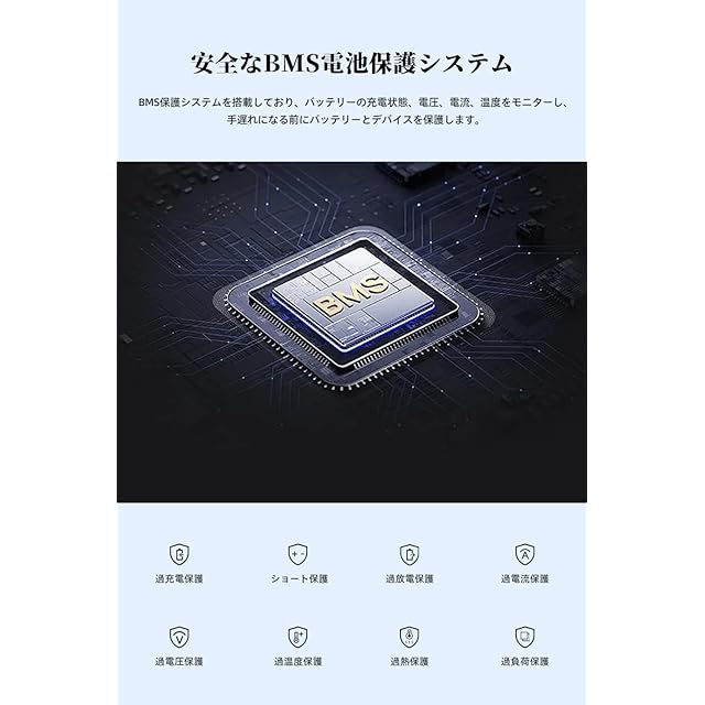 【安全安心!PSE認証済&BMSシステム】 内蔵の高性能冷却ファンは、室温が40℃を超えるか、総出力120Wを超えると自動的にオンになり、素早く熱を放散させます。PSE認証も取得し、安全性の高いリチウム電池を使用することで、電池のエネルギー効率を最適化しながら長寿命化を実現しています。BMS(バッテリーマネージメントシステム)により、適切な電圧・温度制御を行い、過充電・過放電を防止し、安全性を向上させます。