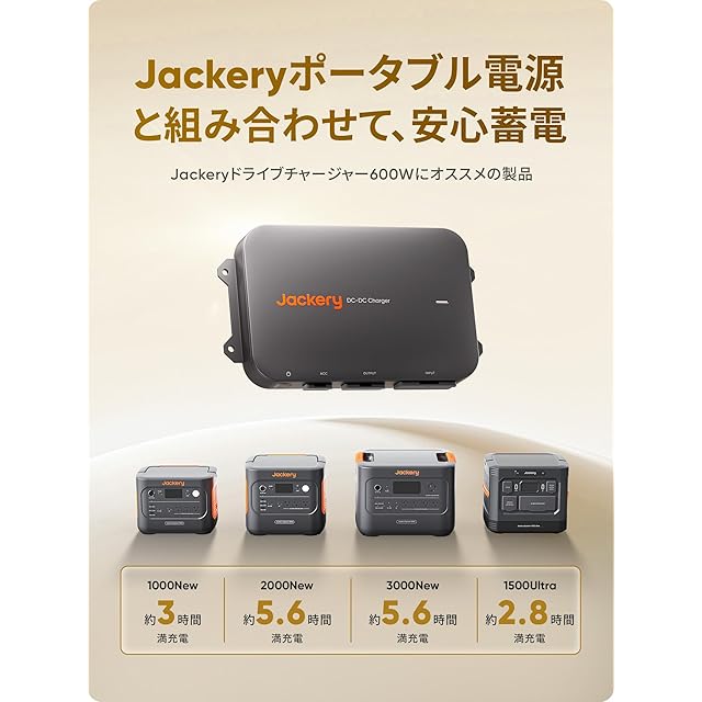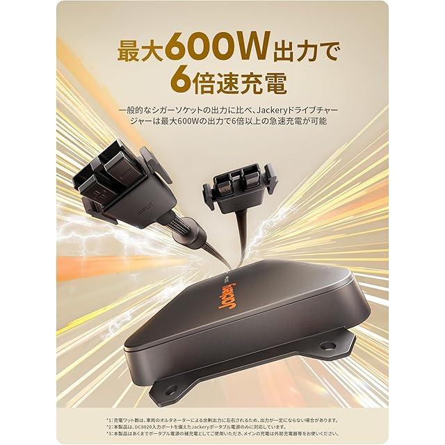 【 最大600W出力で6倍速充電】一般的なシガーソケットの出力(約100W)に比べ、Jackeryドライブチャージャーは最大600Wと6倍以上の急速充電が可能です。 Jackery Drive Charger 600Wにオススメの製品:Jackery ポータブル電源 1000 New (約3時間で満充電)、 Jackery ポータブル電源 1500 Ultra (約2.8時間で満充電)、 Jackery ポータブル電源 2000 New (約5.6時間で満充電)、 Jackery ポータブル電源 3000 New (約5.6時間で満充電)。 【対応機種】proシリーズ/newシリーズ(※240 Newは除く)/plusシリーズ(Explorer 100 Plus、ポータブル電源 300 Plusは除く) 【注意】DC7909ポートを変換して接続することはできません。1500、300 Plus、240 New、100 Plus などは使用不可です。
