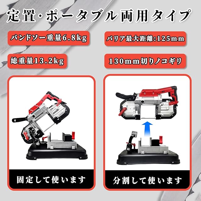 商品名:CXCESNS バンドソー ポータブル 100V 最大切断径Φ127mm 電源コード式 1500W 定置·ポータブル両用タイプ 正確な切断 LED灯付 【鉄 木材 ステンレス 丸パイプ 角パイプ 難削材 切断機 切断 帯鋸 帯のこ 0~45度 直角切り 角度切り 電動工具 DIYツール 工具 用品】 卓上バンドソー