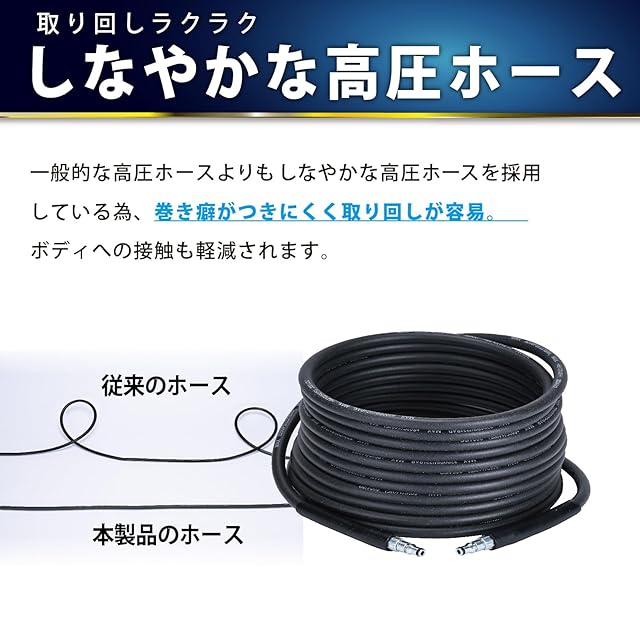 【取り回しのしやすい高圧ホース付き】一般的な高圧ホースよりも巻き癖がつきにくく、取り回しがしやすい高圧ホースを採用。