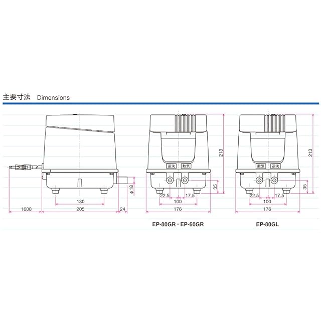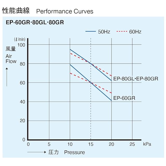 【商品特長】<br>◆タイマーによる自動逆洗機能を搭載したモデルです。<br> ◆吐出口は右側散気(EP-80GR)及び、左側散気(EP-80GL)をラインアップ。<br>◆逆洗タイマーの切替は1日最大24回設定でマルチに対応ができる、業界トップレベルの低消費電力化を実現。<br>◆また、二重絶縁構造採用によりアース工事が不要となり、全方位検知機能保護スイッチで、ダイヤフラム破損時のエアーポンプ内部の破損トラブルを解消。<br><br>【電 圧】単相 AC100V<br>【周波数】50/60Hz<br>【常用圧力】14.7KPa<br>【使用圧力範囲】10~20kPa<br>【常用消費電力】50Hz/51W 60Hz/51W<br>【定格風量】80L/min<br>【吐出口径】φ18mm (VP13)<br>【質 量】7.3kg<br>【騒音レベル】36dB-1m<br>【逆洗時間/逆洗回数】1~20分/回、1~24回/日<br>【用 途】浄化槽<br><br>※現場設置の吐出タイプにより左側散気(EP-80GL)又は右側散気(EP-80GR)からお選び頂けます。<br>※タイマーは、現場設置状況に合わせて逆洗開始時刻・逆洗終了時刻の設定が別途必要となります。<br>※逆洗時、可変風量タイプには対応しておりません。<br>※仕様・性能曲線はカタログ参考値(代表値)であり、値ではありません。<br>※パッケージは予告なく変更されることがあります。