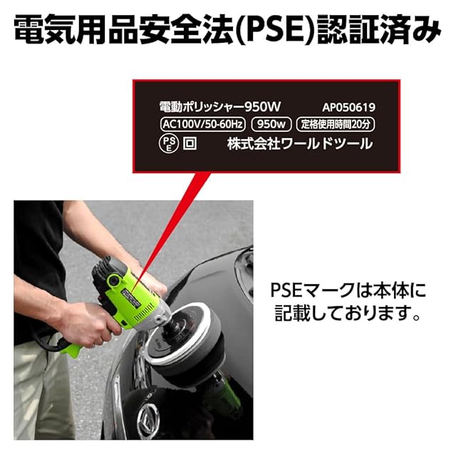 ■商品説明:<br>洗車キズや水垢落としなど、車のボディー磨きには欠かせない電動ポリッシャーです。<br>スポンジバフの脱着は面ファスナー式で、コンパウンドの種類や研磨面に合わせ、簡単に交換できます。<br>回転速度を無段階で調節することや、最低速固定にすることも可能です。<br>・PSEマーク取得済 (届出事業者名:株式会社ワールドツール)<br>■注意事項:<br>※AC100V電源専用です。発電機、直流電源、その他の電源、電圧では使用できません。<br>※ハンドルとグリップをしっかり握って使用してください。片手での使用は、回転の反動を支えきれない恐れがあり、ケガや事故の原因となります。<br>※押し付け過ぎると、作動不良や、モーターの焼き付き、加工面にキズがつく恐れがあるので、自重程度の重さで、均一な圧力を掛けて使用してください。<br>※必ず、定格使用時間を守って使用してください。また、定格使用時間は、気温や使用状況によって短くなる場合があります。