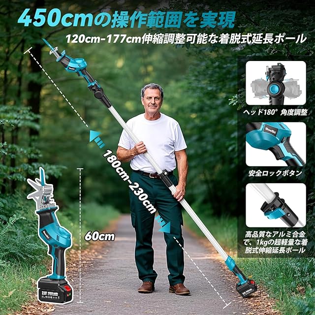 【改良された高枝ガーデンポールソーが登場!】改良点❶:固定クランプを備えておりますので、使用中に鋸がズレることなく、破損のおそれがありません。安心してお使いいただけますよ。改良点➋:高品質なアルミニウム合金で作られた着脱式の伸縮延長杆が付属しています。軽量で、わずか1kg という重さですから、持ちやすく、高いところでの作業にも大変便利です。ヘッドを簡単に切り替えるだけで高枝チェーンソー、手持ちヘッジトリマーが含まれており、あらゆる庭のニーズに対応します。