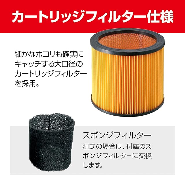 付属品:ホース(28mm×1.8m)×1・カートリッジフィルター(乾式用)×1・フィルターロック×1・スポンジフィルター(湿式用)×1・延長管×2・床ブラシ(乾湿両用)×1・スキマノズル×1・肩掛けバンド×1・ホース接続ハンドル×1・パイプアダプター×1・コードフック×1・キャスター×4
