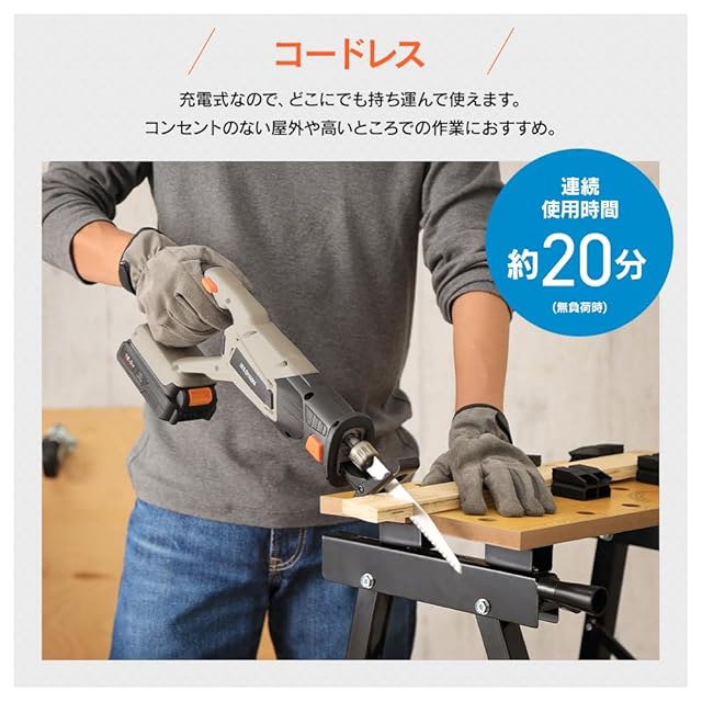◆軽量&コードレス重さ約2.0kg。片手で持てて、邪魔なコードもナシ! 場所を選ばず作業できます。軽いから、長い時間使っても疲れにくい。高い場所の切断にもおすすめ! 連続運転時間約20分(無負荷時)