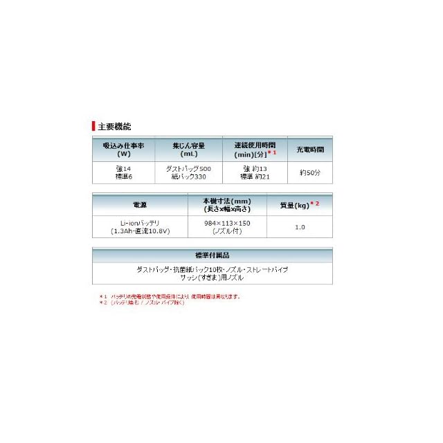 吸込み仕事率:新基準=14/5W(強/標準)(標準付属品のダストバッグ使用時)※1、旧基準=14/6W (強/標準)(標準付属品のダストバッグ使用時)※2 … ※1 測定条件:1.3Ah満充電相当、※2 測定条件:1.3Ah定格電圧相当