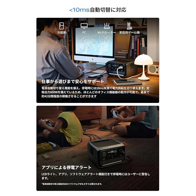 【<10 ms自動切替に対応UPS機能】無停電電源装置としても機能し、停電時は10ms以内に電力を切替え、精密機器をしっかりと保護します。オフィスやゲーム中に突然電力供給が途絶えても、データを保護します。スムーズな作業とプレイをサポートする頼もしい存在です。また、AC出力ポート2口は背面にあり、デバイスのケーブルを隠すことができる設計となっています。さらに、アップグレードされたディスプレイでUPSをリアルタイムにモニタリングできます。