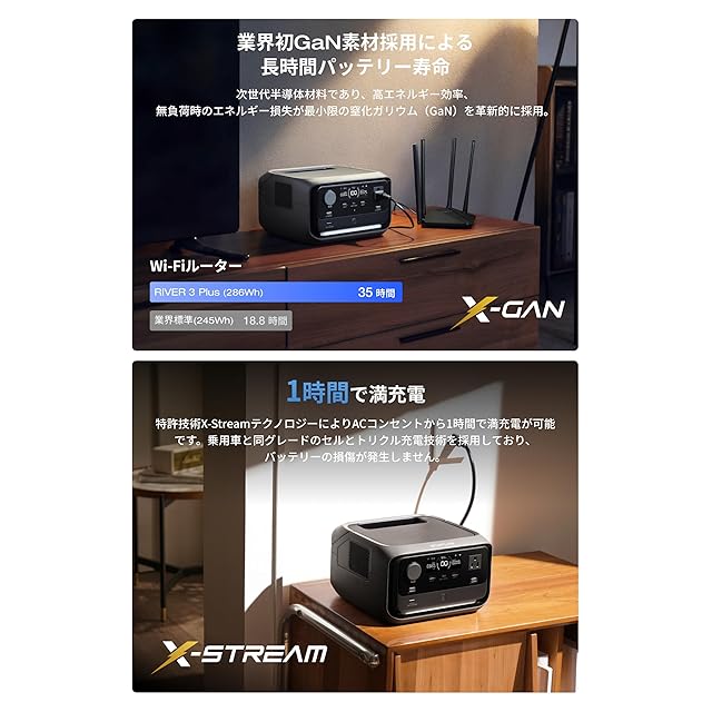 【四つの充電方法·1時間で満充電】特許技術X-StreamテクノロジーによりACコンセントから1時間で満充電が可能です。乗用車と同グレードのセルとトリクル充電技術を採用しており、バッテリーの損傷が発生しません。ソーラー充電の場合は、220Wのソーラー入力で、RIVER 3 Plusをわずか1.5時間で充電できます。さらに、シガーソケット充電とガソリン発電機から充電可能です。