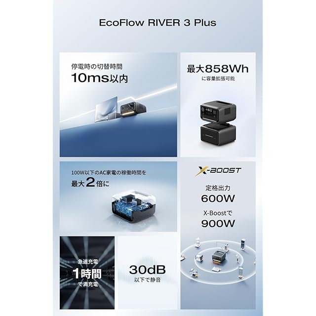 【最大858Whに容量拡張可能】アウトドア時には本体やエクストラバッテリーを手軽に持ち出せ、防災時には容量を拡張して長時間のバックアップを得ることができるため、安心感を得られます。RIVER 3 Plusは、EB290(286Wh)またはEB580(572Wh)との接続に対応し、最大858Whの容量に拡張できます。